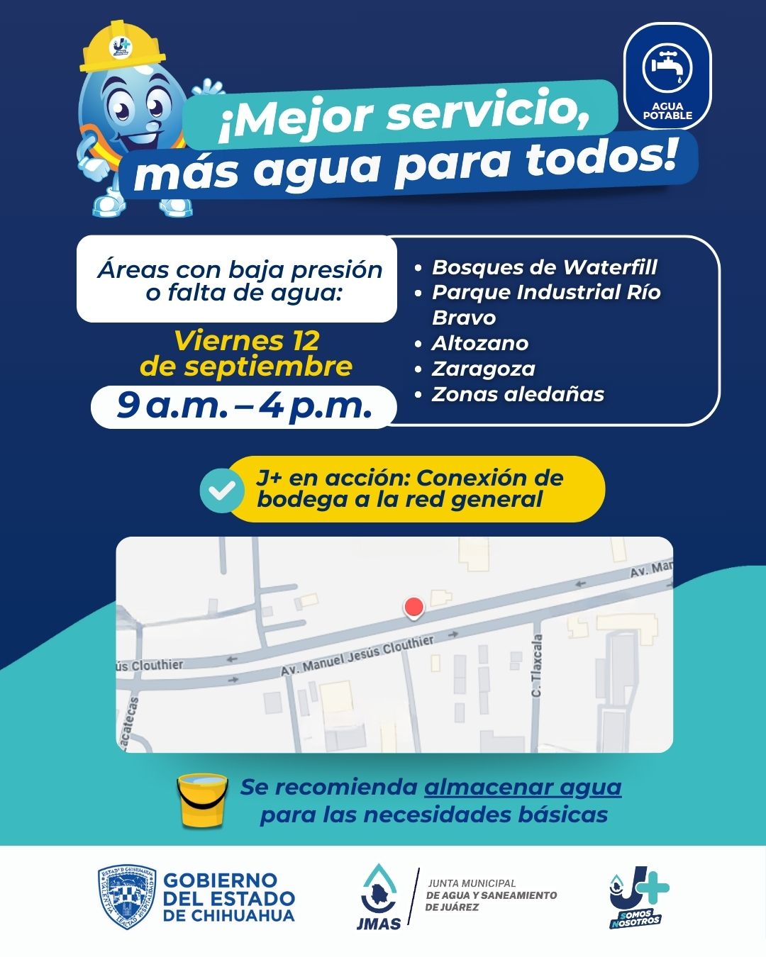 Mañana viernes 12 de septiembre, la Junta de Agua y Saneamiento de Juárez conectará unas bodegas a la red general de agua potable.Los trabajos se realizarán entre las 9:00 de la mañana y las 4 de la tarde del viernes, sobre la prolongación Manuel J. Clouthier en el carril derecho, en sentido de sur a norte.En consecuencia, se impactará la prestación del servicio en los fraccionamientos: Bosques de Waterfill, Parque Industrial Rio Bravo, Altozano, Zaragoza y zonas aledañas.A los guiadores que circulan por la zona, se les exhorta a manejar con precaución o buscar vías alternas, mientras que a los habitantes del sector se les recomienda hacer acopio de agua para las necesidades más apremiantes.