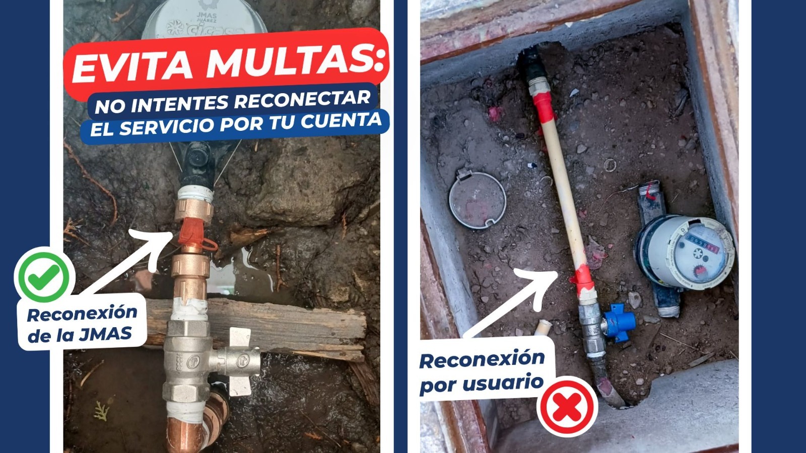 La Junta de Agua y Saneamiento de Juárez, indica a los usuarios que reconectarse por cuenta propia o contratar a terceros para hacerlo, aun cuando ya se haya cubierto el adeudo, es ilegal y puede derivar en sanciones económicas.