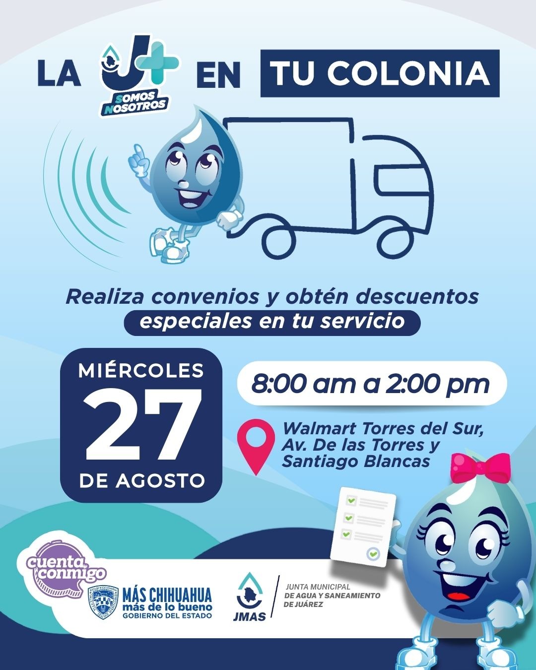 Unidad móvil estará este miércoles en plaza Walmart las Torres (Ave. las Torres y Santiago Blancas) La J+ en tu Colonia es un servicio para la comunidad que se acerca hasta sus casas para darles atención personalizada, por lo que este miércoles 27 de agosto la Unidad Móvil atenderá a los habitantes de las colonias cercanas al cruce de las avenidas Santiago Blancas y De las Torres, en el sur de la ciudad.La unidad de la Junta de Agua y Saneamiento de Juárez estará desde las 8:00 de la mañana hasta las 2:00 de la tarde en el Walmart Torres Sur, donde el personal de Atención Múltiple ofrecerá descuentos y convenios para que los usuarios con algún adeudo puedan regularizar sus cuentas para ponerse al corriente.Los vecinos de las colonias Los Alcaldes, Las Torres, Colinas, Santa Mónica, Infonavit Aeropuerto, Lucio Blanco, Torres del PRI, Porfirio Silva, Bosques de Salvárcar y cercanas, podrán acudir a este módulo para exponer sus casos y llegar a un acuerdo. Con estas acciones, la J+ reafirma el compromiso que tiene con los juarenses al acercar sus servicios a las colonias para regularizar las cuentas y garantizar el servicio en un futuro.