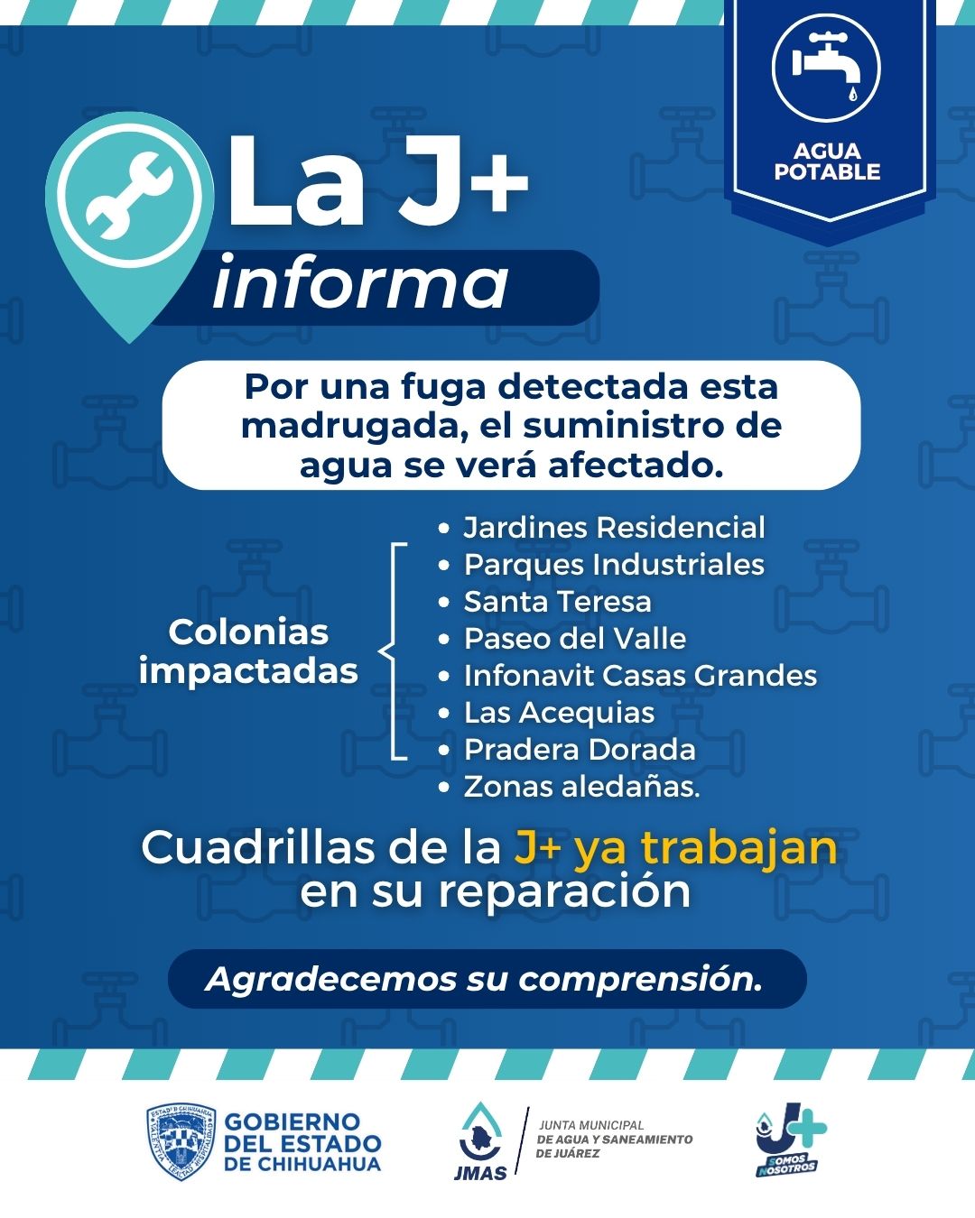 Debido a una fuga reportada la madrugada de este viernes en el fraccionamiento Jardines Residencial, la J+ informa que habrá afectación en el servicio de agua potable en este sector.Tan pronto como se reportó la fuga en la red general, cuadrillas de la Junta de Agua y Saneamiento de Juárez llegaron hasta el lugar para controlar la situación.Desde las primeras horas de este viernes, personal de la J+ iniciará con las reparaciones pertinentes para restablecer la normalidad en el servicio a la brevedad posible.Recientemente, en la zona se hicieron trabajos para la incorporación de un nuevo pozo a la red, con la finalidad de mejorar la presión de agua potable en sectores como Jardines Residencial, Parques Industriales, Santa Teresa, Paseo del Valle, Infonavit Casas Grandes, Las Acequias y zonas aledañas.