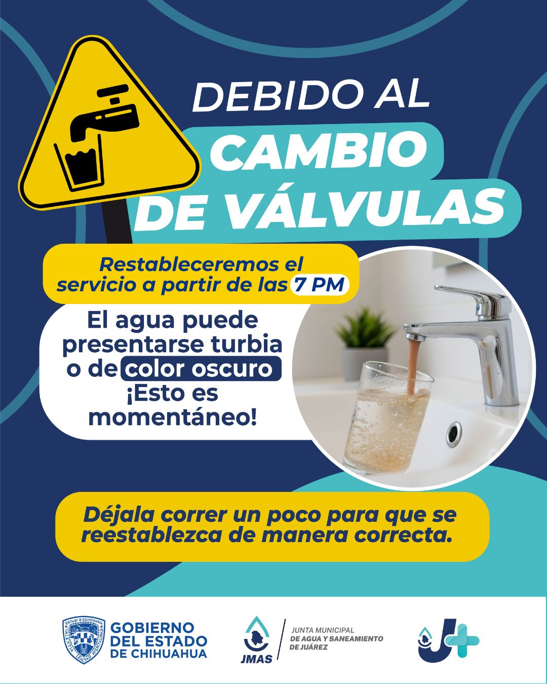 La Junta de Agua y Saneamiento de Ciudad Juárez, informa que a partir de las 7 de la tarde se iniciará a restablecer el servicio de agua potable en algunas zonas de la ciudad, derivado de los cambios de válvulas en 15 puntos de la ciudad. La Ingeniera Paola Moreno, directora de Operaciones de la J+ informó que como se cambiaron las válvulas el punto será que llegará el agua revuelta a las casas de las familias, por lo cual, solicitaron abrir las llaves para que salga esa agua revuelta de la tubería hasta lograr que llegue el agua limpia a los hogares. Esto es parte del proceso de cambio de válvulas para mejorar el servicio de suministro y presión en zonas de la ciudad. El restablecimiento del servicio se dará en las colonias Melchor Ocampo, Silvias, Partido Escobedo, Partido Díaz, Parque Industrial Omega y zonas aledañas.