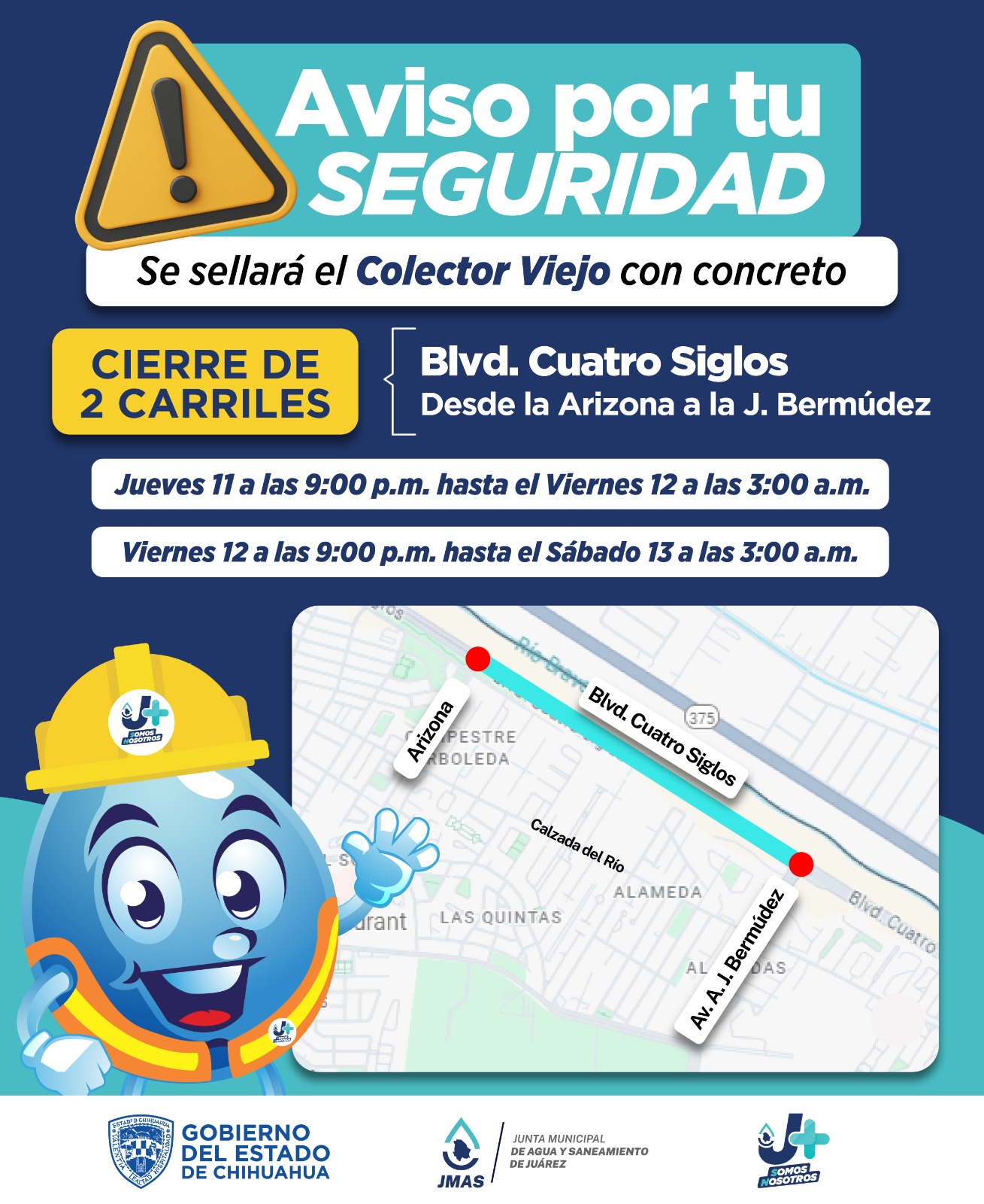 Los trabajos preventivos de seguridad, se realizarán el jueves y viernes por la noche desde la calle Arizona a la Ave. J. Bermúdez. La J+ anunció que después de concluir la conexión del nuevo colector en el Boulevard Cuatro Siglos, ahora iniciarán los trabajos preventivos de seguridad para sellar el colector viejo, con el fin de que ya no represente riesgo de hundimientos en la vialidad.Isidro Morales, encargado de las cuadrillas de Campo de la Dirección Técnica de la J+ explicó que estas acciones consisten en clausurar de manera definitiva el antiguo colector de concreto, en el tramo de la calle Arizona hasta la avenida Antonio J. Bermúdez.“Queremos garantizar una superficie sólida y segura para todos los que transitan por esta importante vialidad. Por eso utilizaremos un cemento especial que sellará por completo el colector antiguo”, señaló.Para realizar estos trabajos será necesario el cierre de dos carriles en sentido poniente a oriente, en horarios nocturnos, con el objetivo de reducir al mínimo las afectaciones al tráfico vehicular. Horarios de cierre• Jueves 11 de septiembre: de 9:00 p.m. a 3:00 a.m. del viernes 12 de septiembre• Viernes 12 de septiembre: de 9:00 p.m. a 3:00 a.m. del sábado 13 de septiembre“Por indicaciones de nuestro director ejecutivo, Sergio Nevárez, trabajamos de noche para no interrumpir el tráfico diario y causar las menores molestias posibles a la ciudadanía”, agregó Morales. La J+ agradece la comprensión de la comunidad y reitera su compromiso de seguir trabajando en obras que brinden más seguridad y tranquilidad a las familias juarenses.